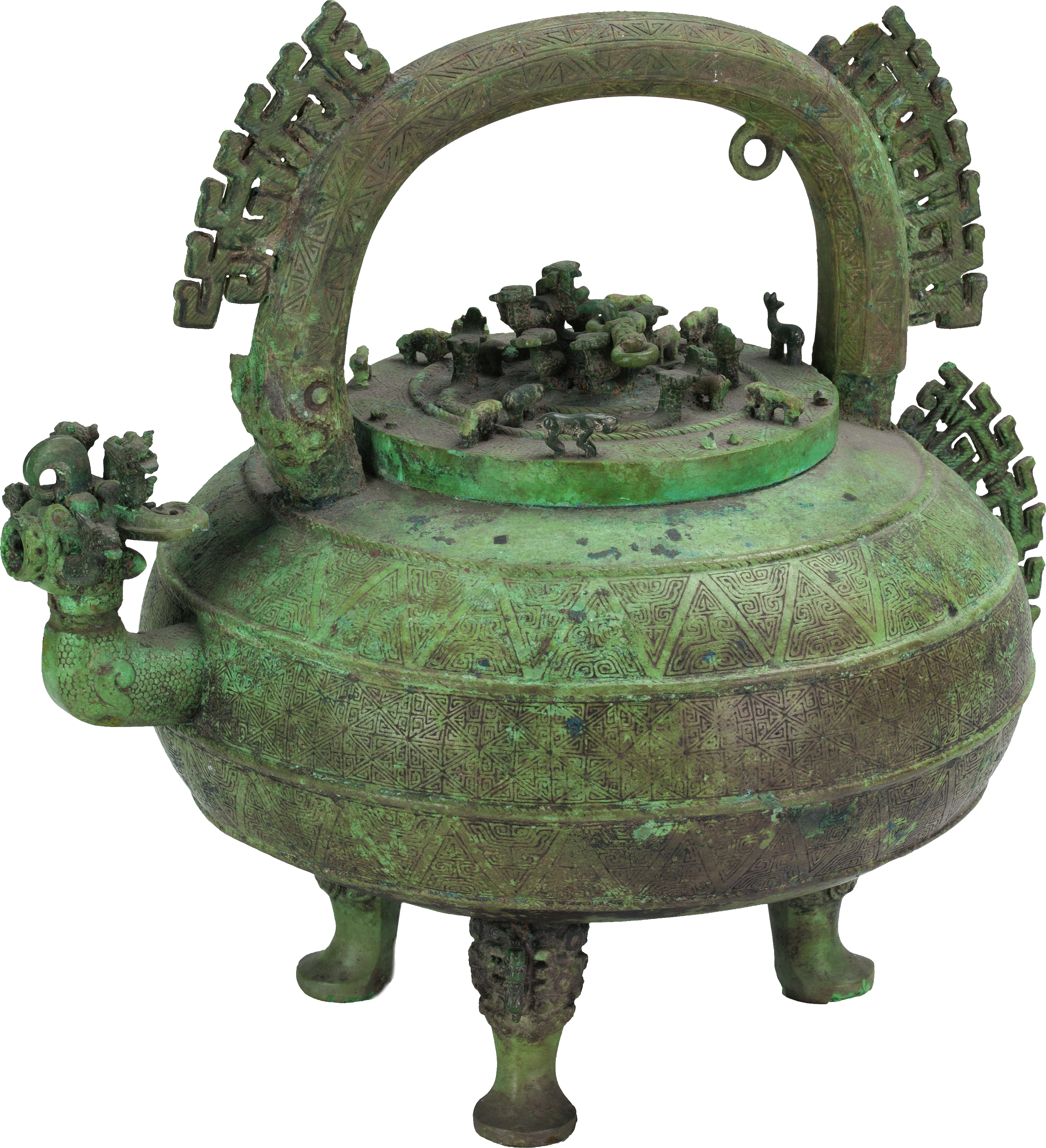 青铜盉器型源自陶盉,在商周时期既可作酒器也可作水器。春秋晚期的提梁盉基本形制为腹部呈椭圆形,小口直颈,有盖,肩上有提梁,多呈夔龙形,或用链条与盖相连,曲管状兽首流,三蹄形足。值得注意的是,在与流对应的一侧腹部或提梁上有镂空扉棱,从盉的侧面看去,曲管状流、夔龙形提梁和镂空扉棱三者组成了一个整体,即类似于昂首、曲体、翘尾的龙形动物。